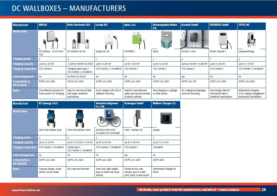 The market overview divides over 260 products from 87 national and international manufacturers, both by charging stations and wallboxes, as well as AC (normal charging stations) and DC (fast charging stations). The products are characterized according to the following categories: